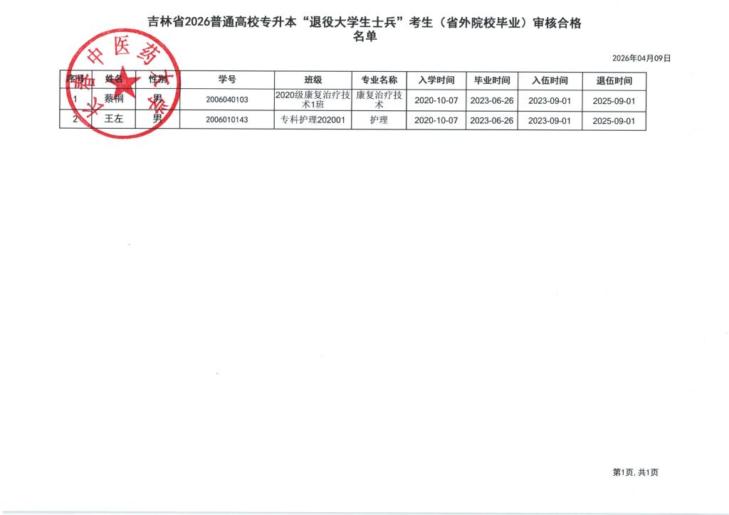 按照吉林省教育厅《关于做好吉林省2026年普通高等学校专升本考试招生工作的通知》(吉教考〔2026〕12号)要求,经学生本人申请,招生与就业处审核,我校2名考生符合2026年吉林省普通高等学校专升本考试“退役大学生士兵”免试条件,现将审核合格名单予以公示。